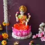 This beautiful statue depicts the Hindu goddess Lakshmi sitting on a lotus flower. Lakshmi is the goddess of prosperity, wealth, fortune, and auspiciousness. The statue is made of marble and is hand-painted. It is 10.5 inches tall and would be a perfect addition to your home, office, or puja room.