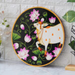 Crafted on a wooden plate, this pichwai portrays an auspicious vision of a white cow, a symbol of good luck and prosperity in Hindu culture, adorned with a magnificent floral headdress. The intricate details and vibrant colors create a visually stunning and meaningful artwork.