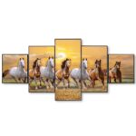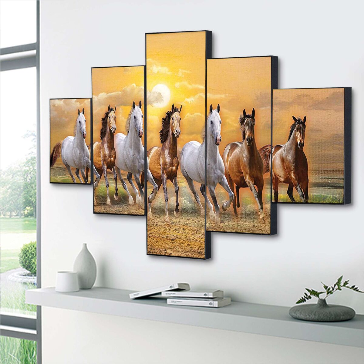 Saumic Craft Presents This Set Of 5 Amazing Paintings For Your Wall . The Painting Will Completely Change The Atmosphere Of The Room Whire It is Placed . The Paintimg Is Made On Heavy Wooden Board And Has A Digital UV Coating On It Which MAKES It Very Easy To Clean . Pricing Of The Product Is Made Very Reasonable From Our Brand As Per The Quality We Are Providing To Our Customers, We Assure That You Will Not Regret Your Purchase, Saumic Craft Is Well Known for Its After Sale Services And In Case If You Feel Some Problem With Any Of Our Product Than You Can Replace It For Free With No Additional Cost . This painting offers a stylish look to your wall as this piece includes three themes it is vastu and also have the essence of abstract and modern art which makes this peice unique and stylish . The 5 pieces wall painting is made with high-quality material, the HD quality print looks fantastic and bright it will not fade easily. With just few simple steps you can mount it to the wall. Thank You For Yor Purchase